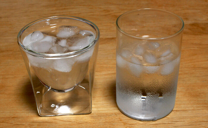 ダブルウォールグラスでは外側の面が空気を冷やすほど冷たくならないので、氷を入れた冷たい飲み物を飲んでも机を濡らさず、コースター要らずで使えます。